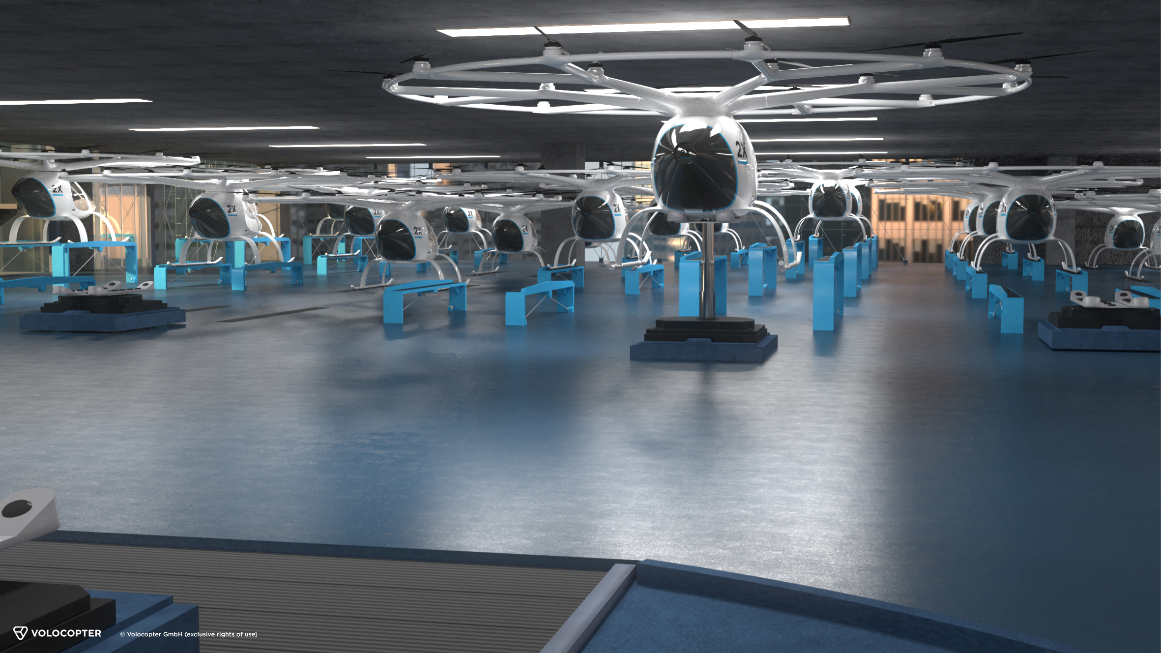 The presented concept defines the infrastructure necessary to operate and scale an air taxi service into a full network system spanning over mega cities. It consists of Volo-Hubs and Volo-Ports. The Volo-Hubs resemble cable cart stations with Volocopters landing and taking off every 30 seconds for example. Once landed the Volocopter is moved inside the Volo-Hub. Passengers alight the aircraft protected from wind and weather. Battery packs will be swapped automatically in a protected area by robots before moving on to the section, where passengers embark for take-off. Volo-Hubs are the key to substantially increase the capacity of any Volocopter system. Aside from protected deboarding and embarking, they offer sufficient space to park all Volocopters in operation and provide the infrastructure for charging and maintenance.